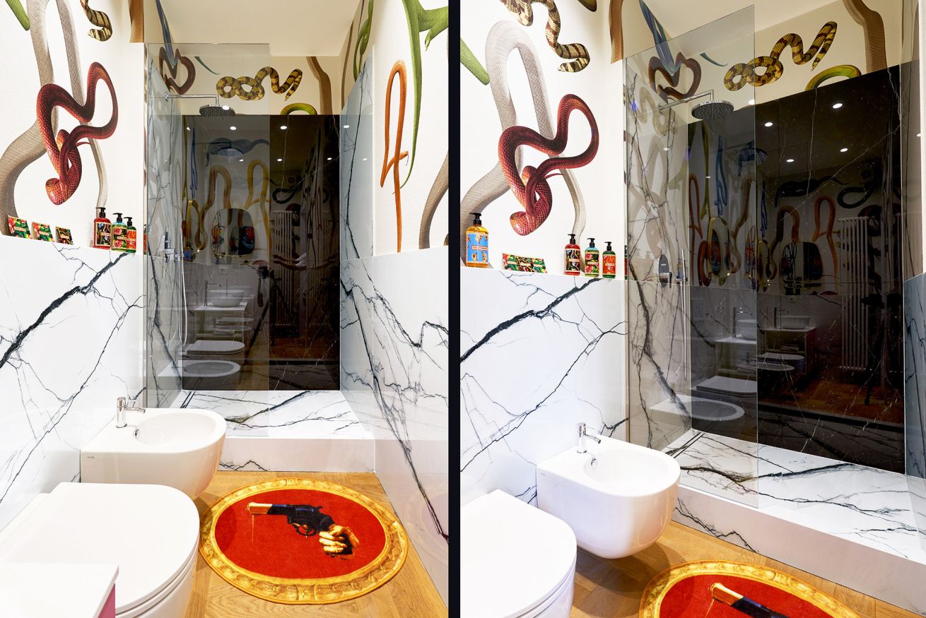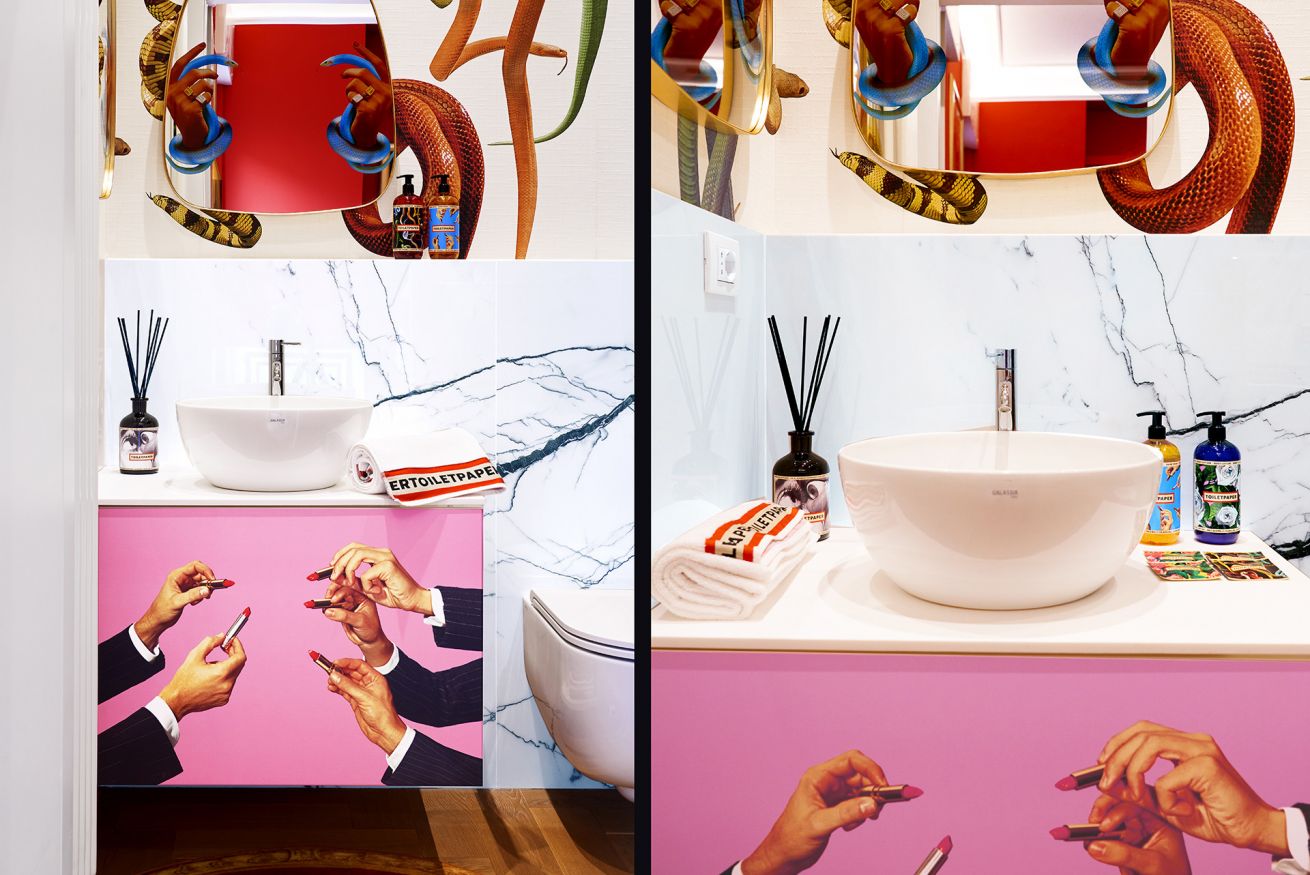 It is a design and art lovers paradise, where guests will come up close and person with Toiletpaper fine art prints that adorn the walls and iconic design pieces such as the Gufram x Toiletpaper “Giant Soap” or the legendary Memphis “Peninsula” table featuring a customised Toiletpaper tabletop.