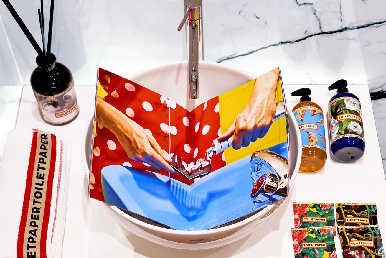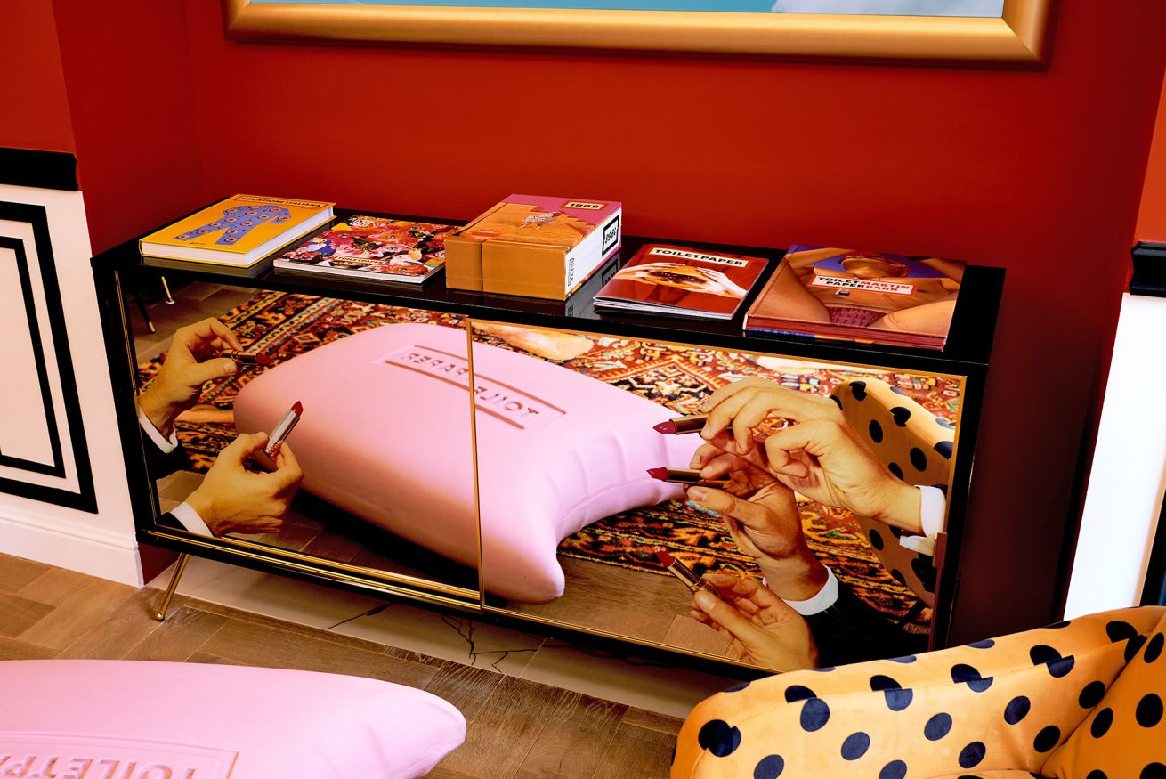 Homewares and furniture by Toiletpaper Home (a collaboration with Italian pop design brand Seletti), a Lavazza x Toiletpaper coffee machine, Toiletpaper Beauty products and LondonArt x Toiletpaper wallpaper complete the space. A selection of Toiletpaper Magazines and limited edition Toiletpaper collector’s coffee table books are available for perusal to provide guests with an even deeper immersion into the world of Toiletpaper images.