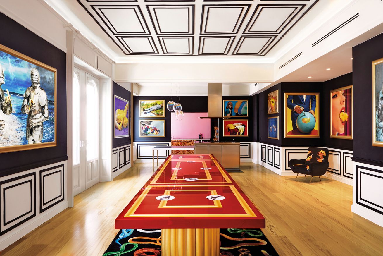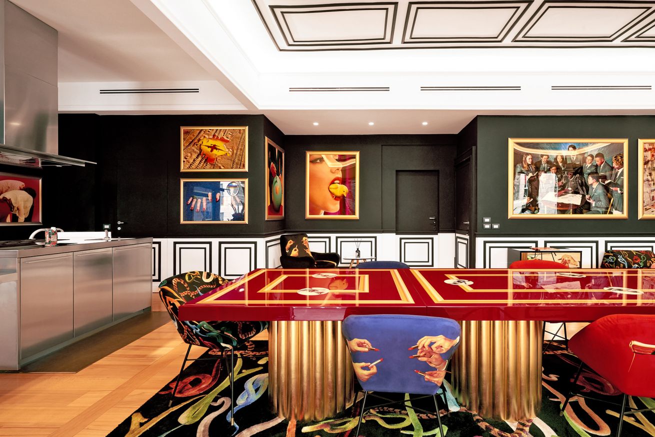 “Supernova” by Toiletpaper Living is literally colossal like the explosion of a star. Starting from its majestic Empire-style Pompeiian-inspired dining table in the main hall, to the graphic black wood panelling, to the sleek stainless steel chef’s kitchen, everything in this apartment gives a sense of pure aesthetism and grandeur.