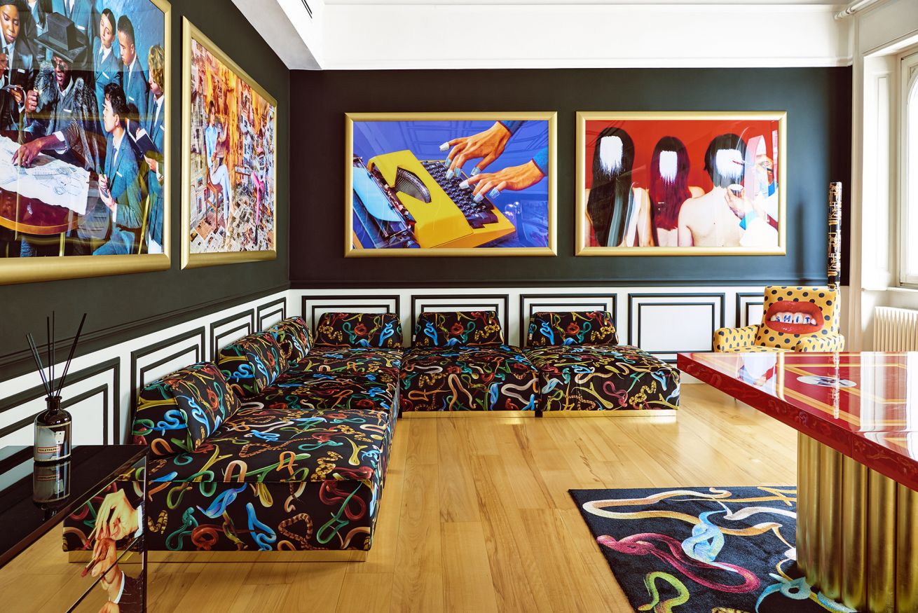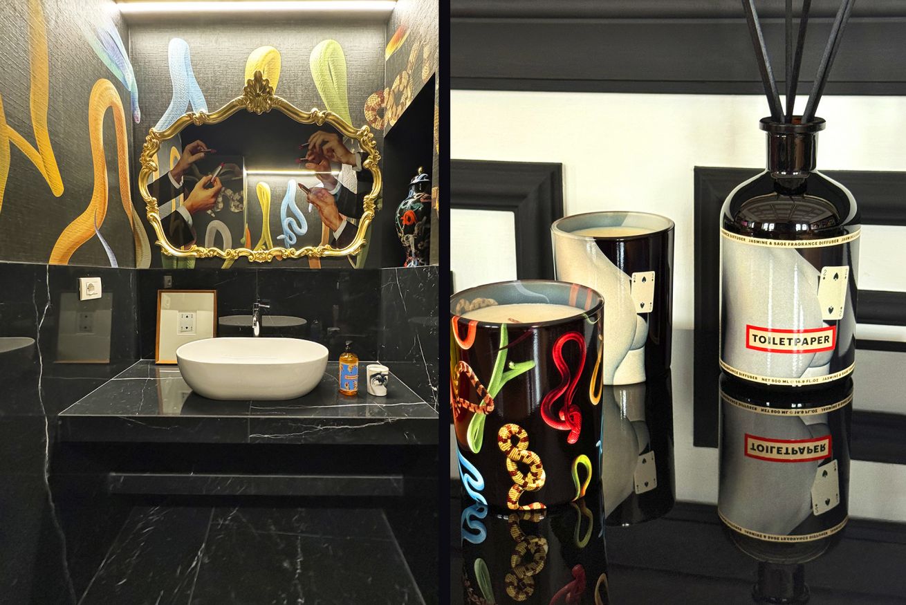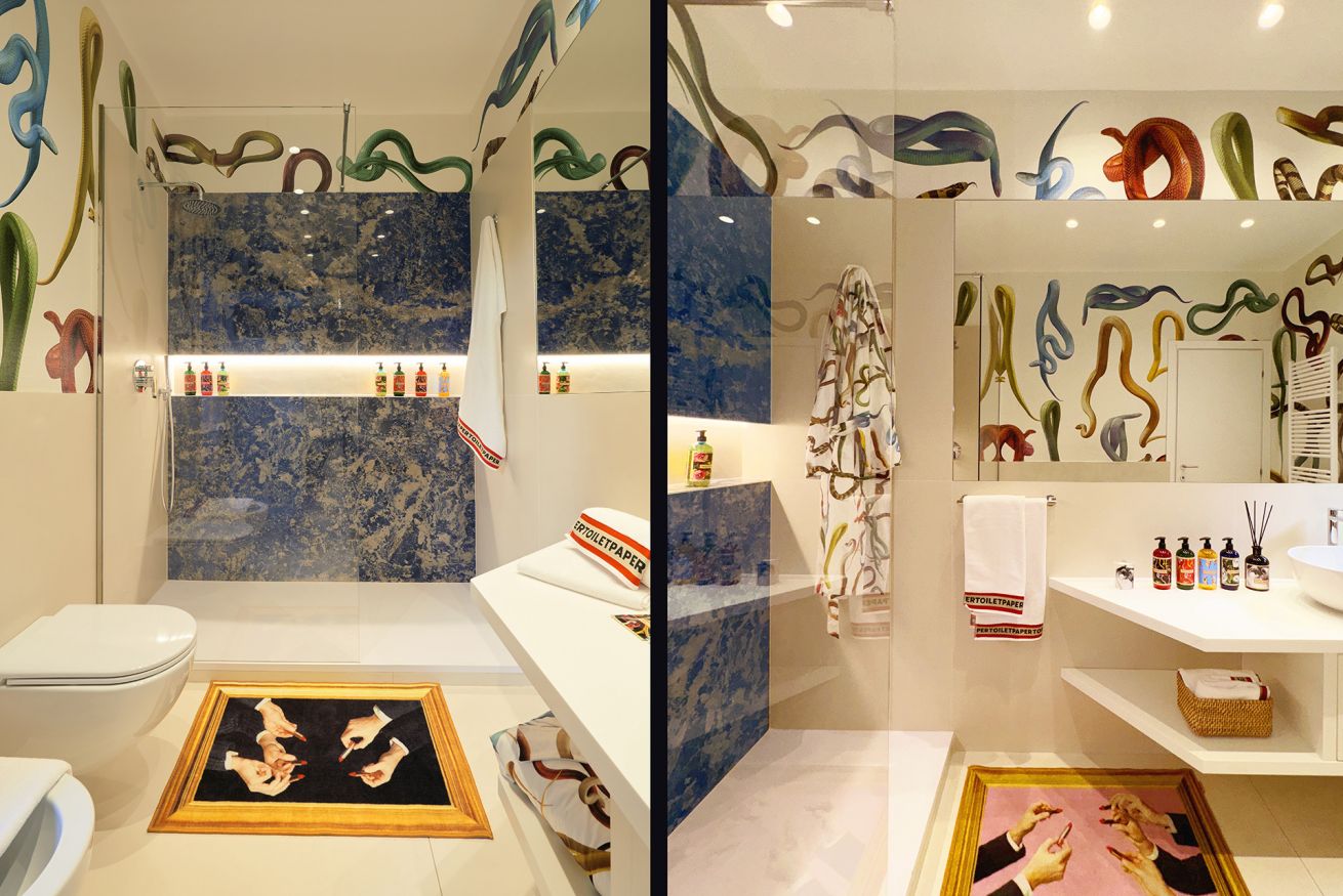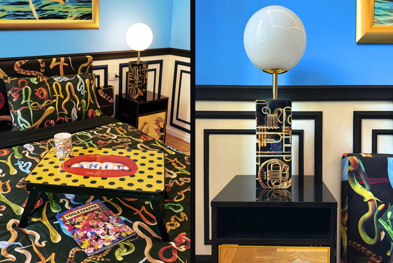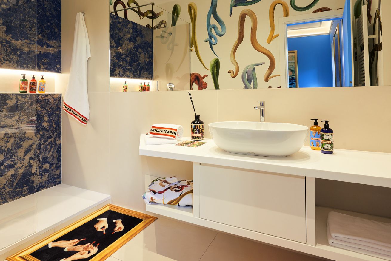 It is a design and art lovers paradise, where guests will come up close and personal with Toiletpaper fine art photography prints that tranform the walls into surreal landscapes. The apartment is also home to a revolving collection of iconic design pieces such as “God” by Gufram x Toiletpaper or the Artemide “Nebula” lamps. Homewares and furniture by Toiletpaper Home (a collaboration with Italian pop design brand Seletti), Toiletpaper Beauty products and Toiletpaper x LondonArt wallpaper complete the space.