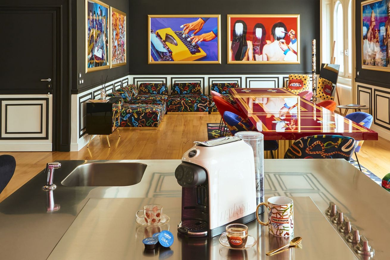 Observers can contemplate the iconic printed Toiletpaper photos decorating the walls, while thinkers can suspend their thoughts on the tranquil balcony overlooking the verdant garden.